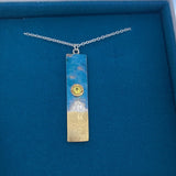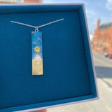Each of these handmade silver sunset couple necklaces is etched with an image of a couple and dog sharing special memories together along the coast. The sun and sand, inlaid with 22ct gold inlay, to highlight their beautiful golden colour. The blue sky is hand painted with vitreous enamel which is fired onto the silver surface.