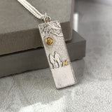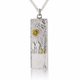 A stunning handmade silver & gold dog necklace featuring two people enjoying a moment with man's best friend beneath a gleaming yellow sapphire sun.