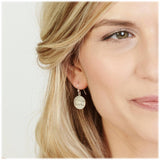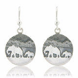 Handmade sterling silver elephant earrings with etched image of elephant and baby elephant walking trunk and tail along the horizon.