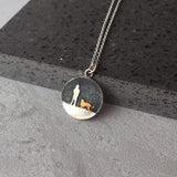 Take a little walk through the countryside with this beautiful sterling silver Walks Under Night's Sky Golden Dog Necklace. A handmade gift for dog lovers celebrating precious moments spent with man's best friend. From strolls in the park to escapes in the countryside the intricate details etched on this necklace serves as a little reminder of the special memories we share with our loved ones.