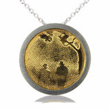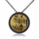Beneath the branches of the trees in the countryside stands a loving couple watching the world go by. Filled with elegance and charm this handmade silver photo necklace captures a beautiful moment shared by two. Its silver frame is oxidised to create a striking black appearance. Our countryside couple necklace symbolises past memories and dreams of days yet to come. Its centre is inlaid with luxurious 22ct gold. Hallmarked sterling silver