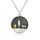 This beautiful Walks Under Night's Sky Necklace with Golden Dog is etched with an image of a dog lover and their two beloved pets walking together, capturing their perfect bond.
