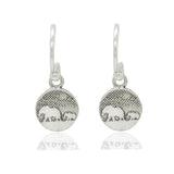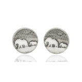 Tiny handmade sterling silver elephant earrings with etched image of elephant and baby elephant walking trunk and tail along the horizon.
