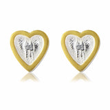 Handmade silver hearts with a golden centre. These silver heart stud earrings are a symbol of the love shared between two, with an intricate etched silhouette of a couple within their centre. Handmade in sterling silver and inlaid with a 22ct gold inlay. Hallmarked sterling silver.